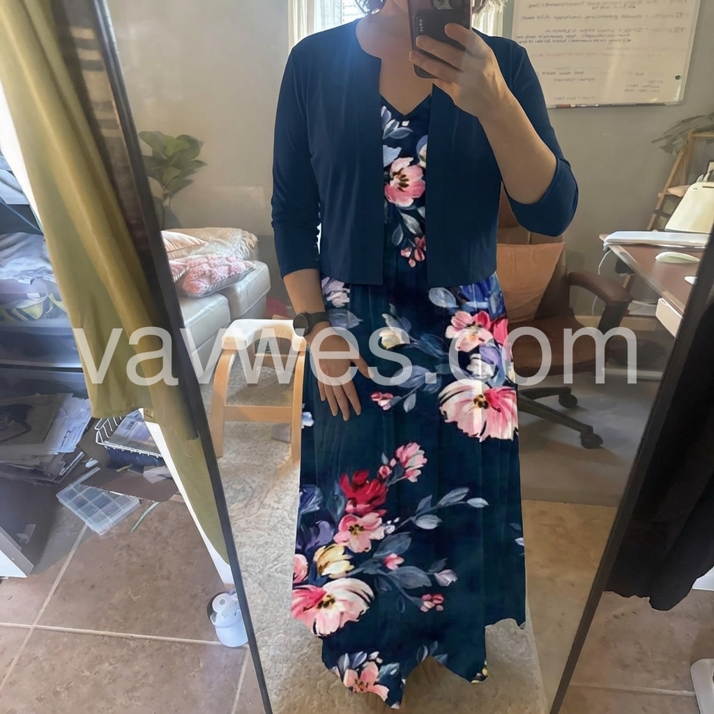 I’m absolutely in love with this dress. So elegant and flattering. The navy base with the vibrant floral print looks rich and eye-catching, and the fit feels just right for everyday wear.