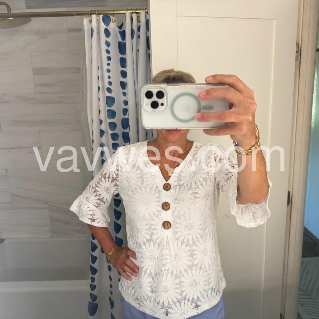 This blouse reimagines timeless femininity with intricate daisy-patterned lace. The crisp white openwork fabric creates a delicate, luminous silhouette, perfect for elevating everyday looks.