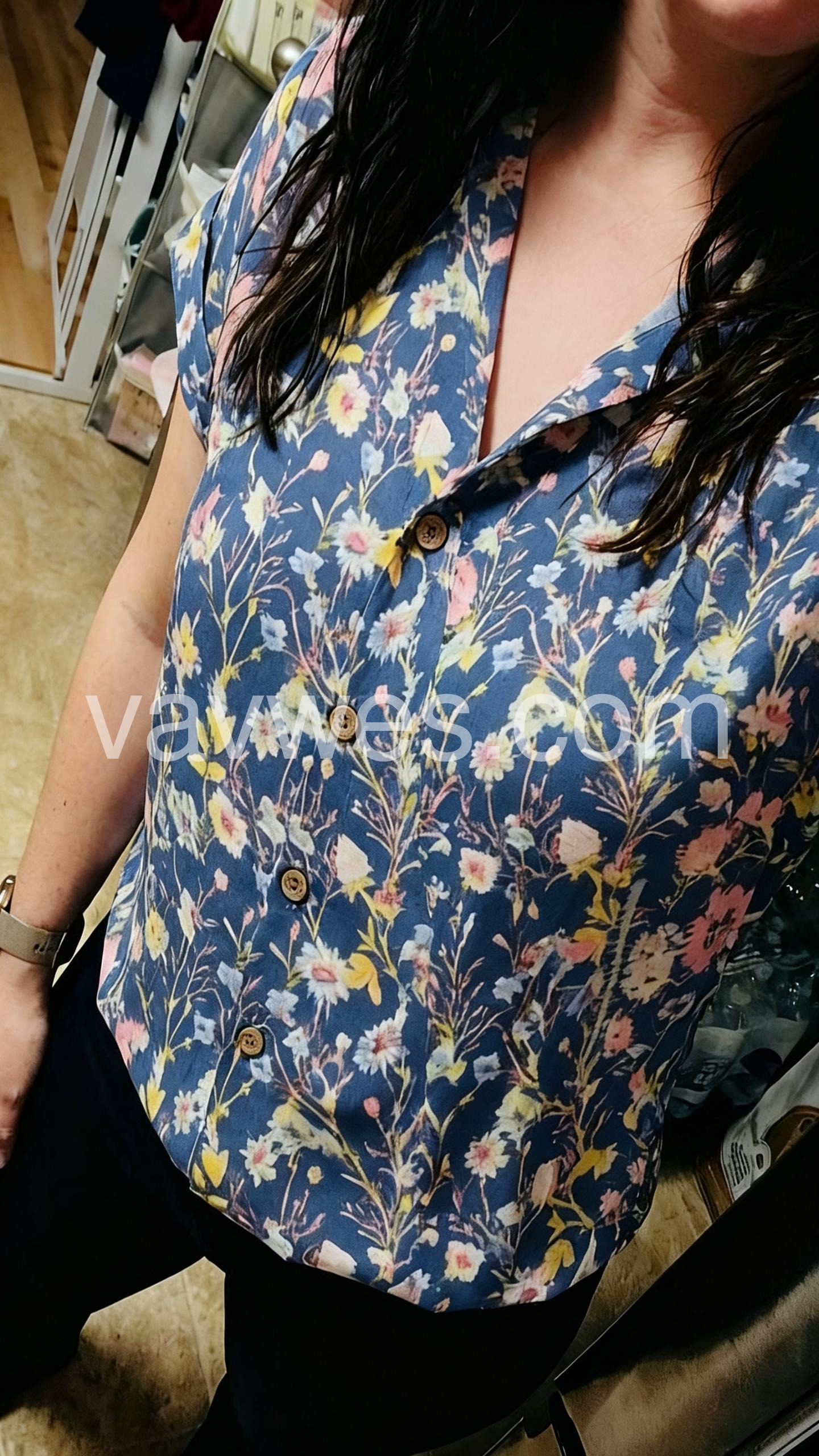 This short-sleeve V-neck blouse features a delicate floral print on a deep navy background. The button-down front adds a polished touch. Lightweight fabric perfect for warm weather. Pair with jeans or skirts for effortless style. Ideal for casual outings or spring days.