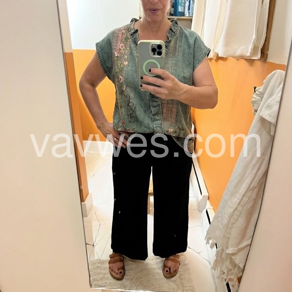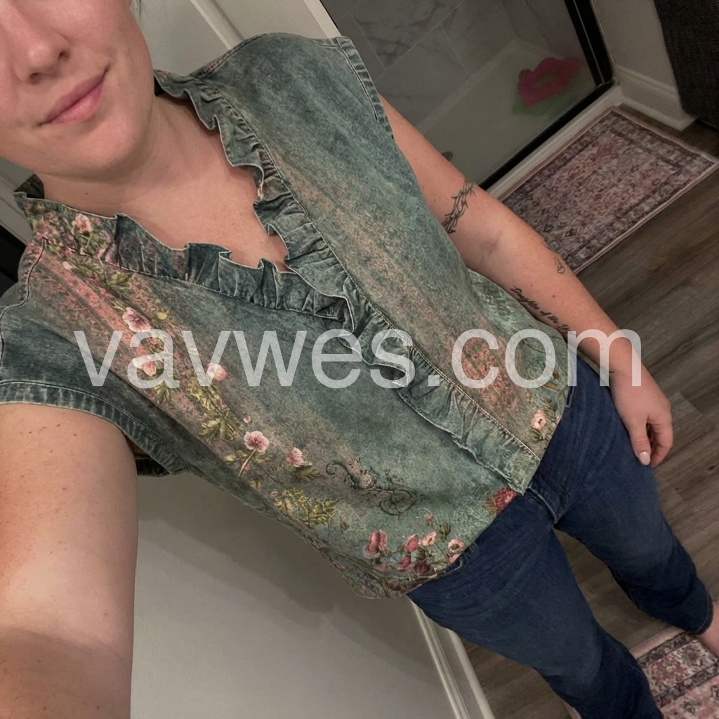 This short-sleeve top blends vintage denim texture with delicate floral prints. The ruffled V-neck adds a feminine touch. Lightweight and relaxed fit for easy wear. Perfect for pairing with white jeans or shorts. Ideal for casual, bohemian-inspired looks.