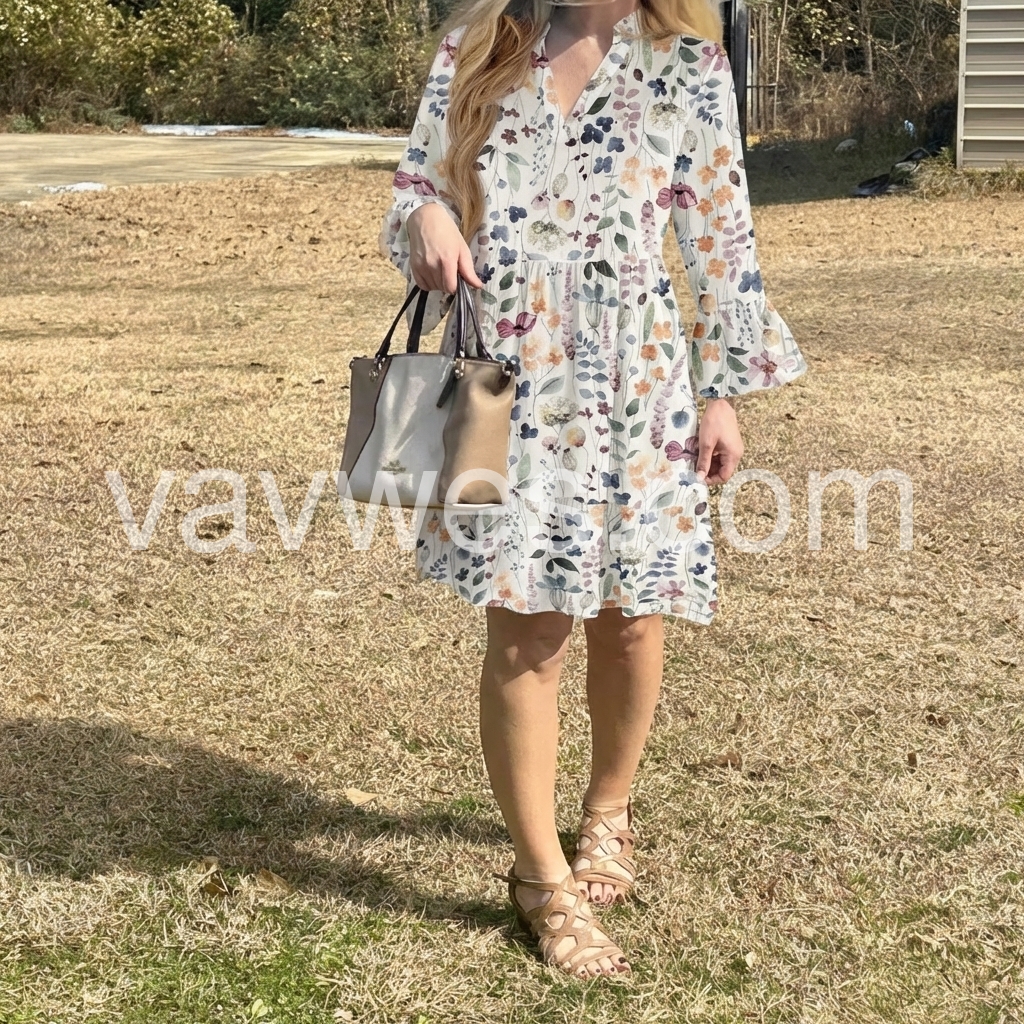 This white floral dress features a V-neck, button-down front, and flared bell sleeves. The tiered skirt adds movement and charm. Soft pastel blooms create a delicate, summery look. Perfect for beach days or casual outings. Lightweight and effortlessly feminine.