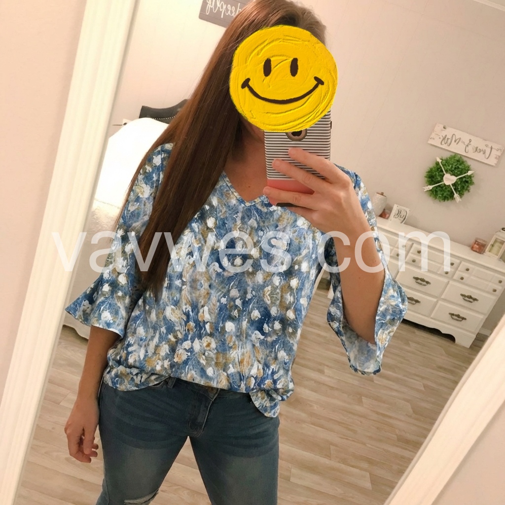 Blue Floral Ruffle Sleeve V-Neck Blouse