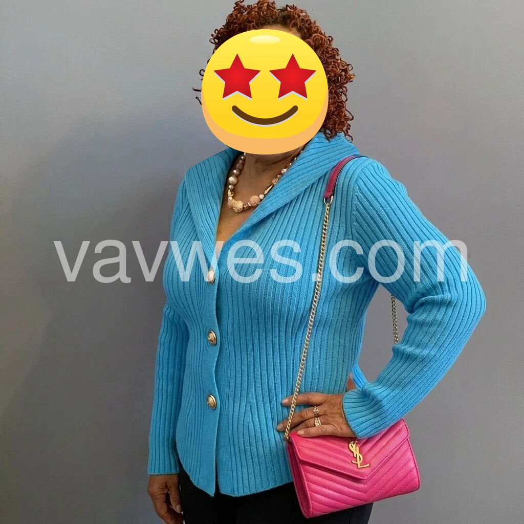 I was hesitant about the color but it’s even better in person! The turquoise hue is vibrant and beautiful, and the ribbed texture is so flattering. The buttons add a luxurious touch, and the wrap-style neckline is so chic. It’s true to size and fits perfectly, not too tight or restrictive. The fabric is warm but not bulky, great for layering or wearing alone. I’m obsessed with this piece!