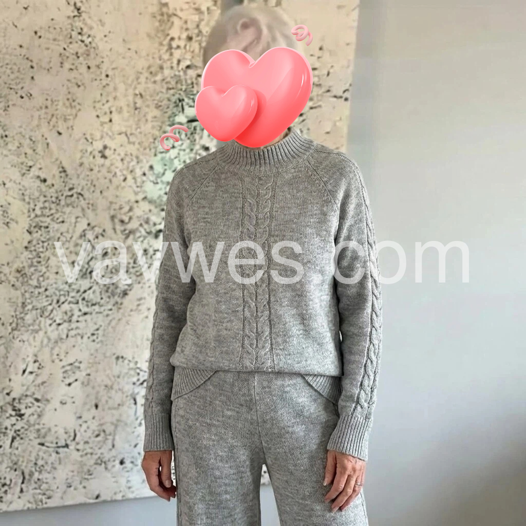 I love this set! The gray knit is soft and warm, and the cable detail on the sweater looks really nice. The pants fit comfortably and the whole outfit has a flattering, relaxed look. It’s perfect for staying in but still looks put together. Looks exactly like the photos and feels well made.