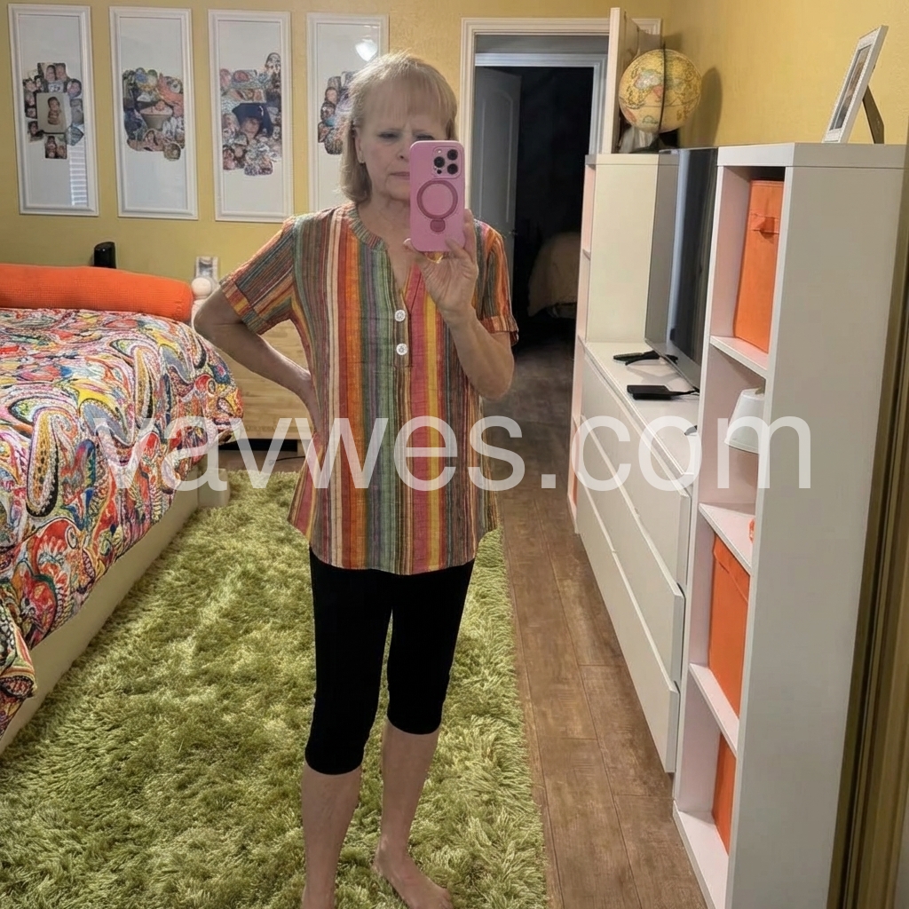 I absolutely love the colors on this top! The vertical stripes are very flattering and give it a fun, retro vibe. It fits true to size and is incredibly comfortable for everyday wear. Highly recommend!