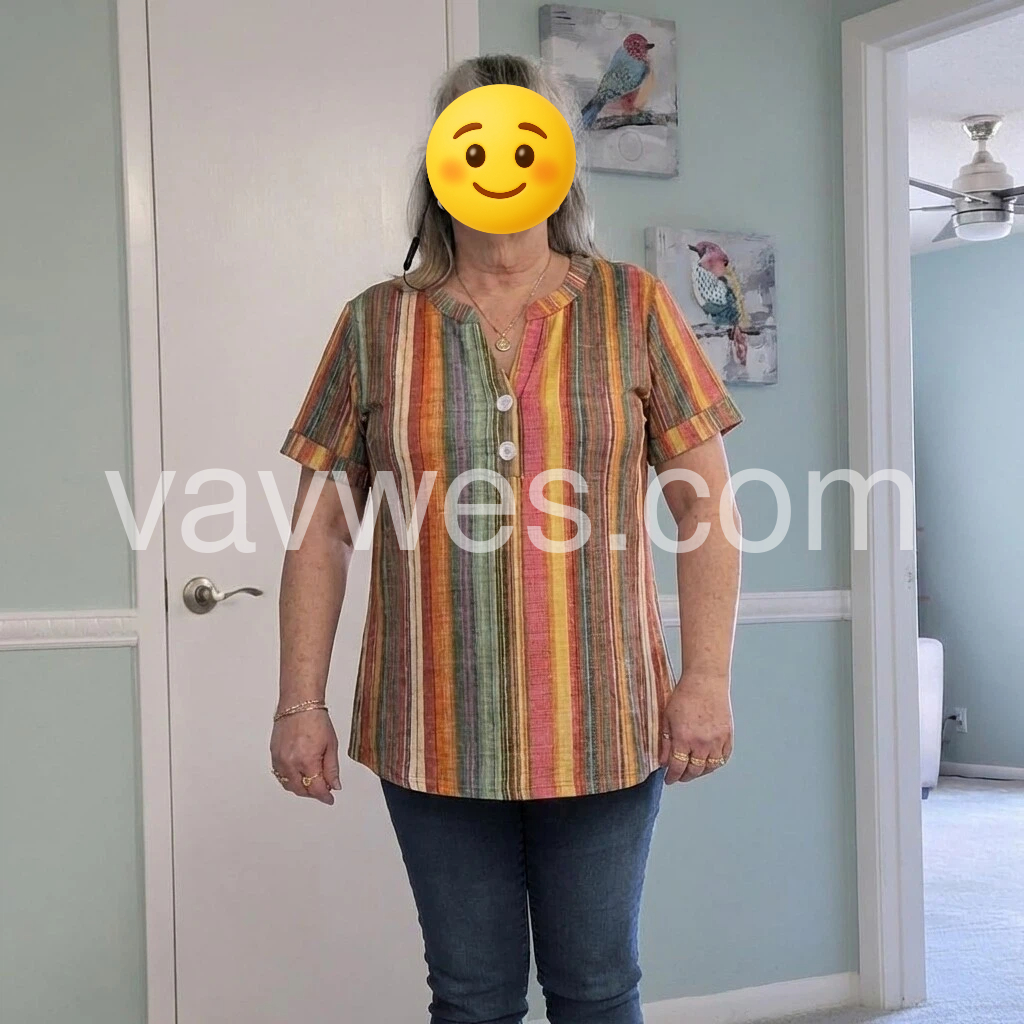 This short-sleeve top features bold vertical stripes in warm tones of orange, red, green, and yellow. V-neckline with button detail for a relaxed look. Lightweight linen blend perfect for summer. Effortlessly stylish and easy to pair. Ideal for casual outings or vacation wear.