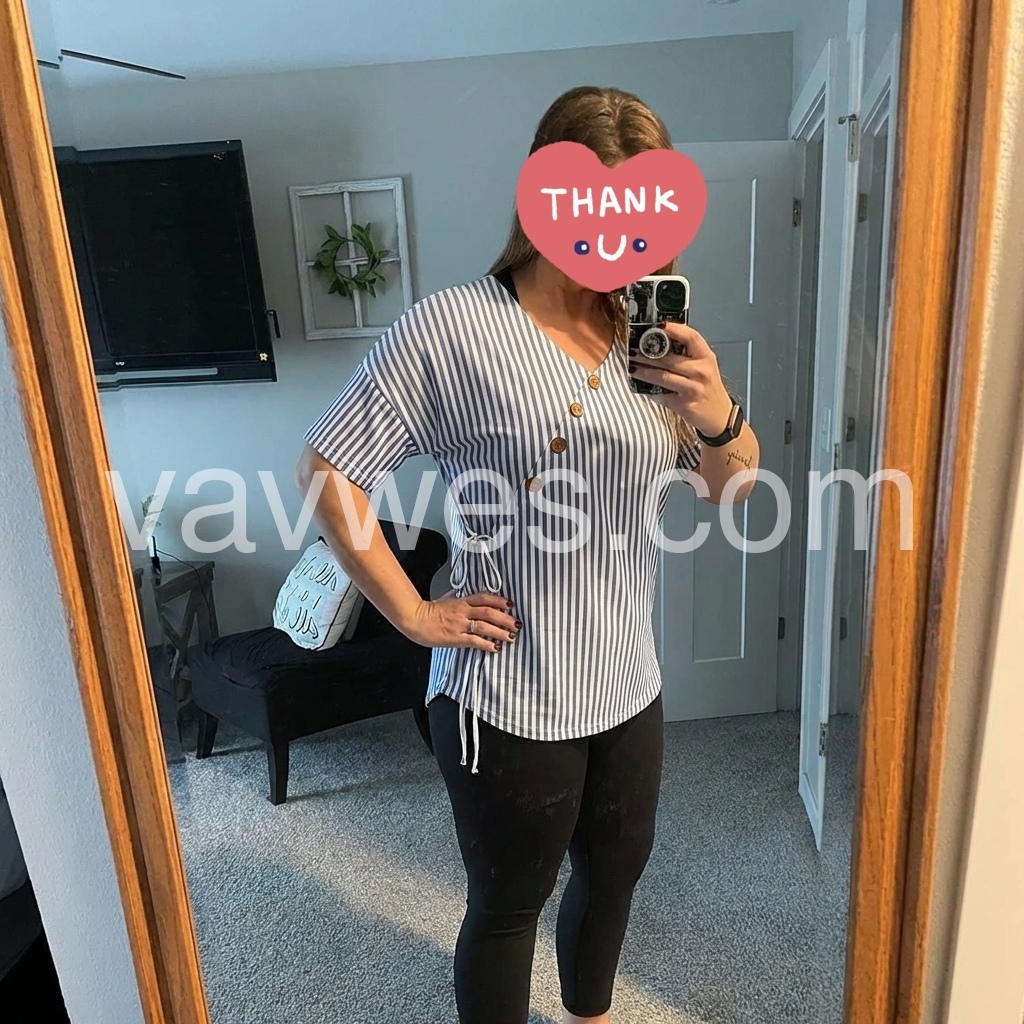 Absolutely love the unique button detail on this top! The asymmetrical design is super flattering and the blue stripes give it a fresh, nautical vibe. It fits true to size and hides my tummy perfectly. Highly recommend!