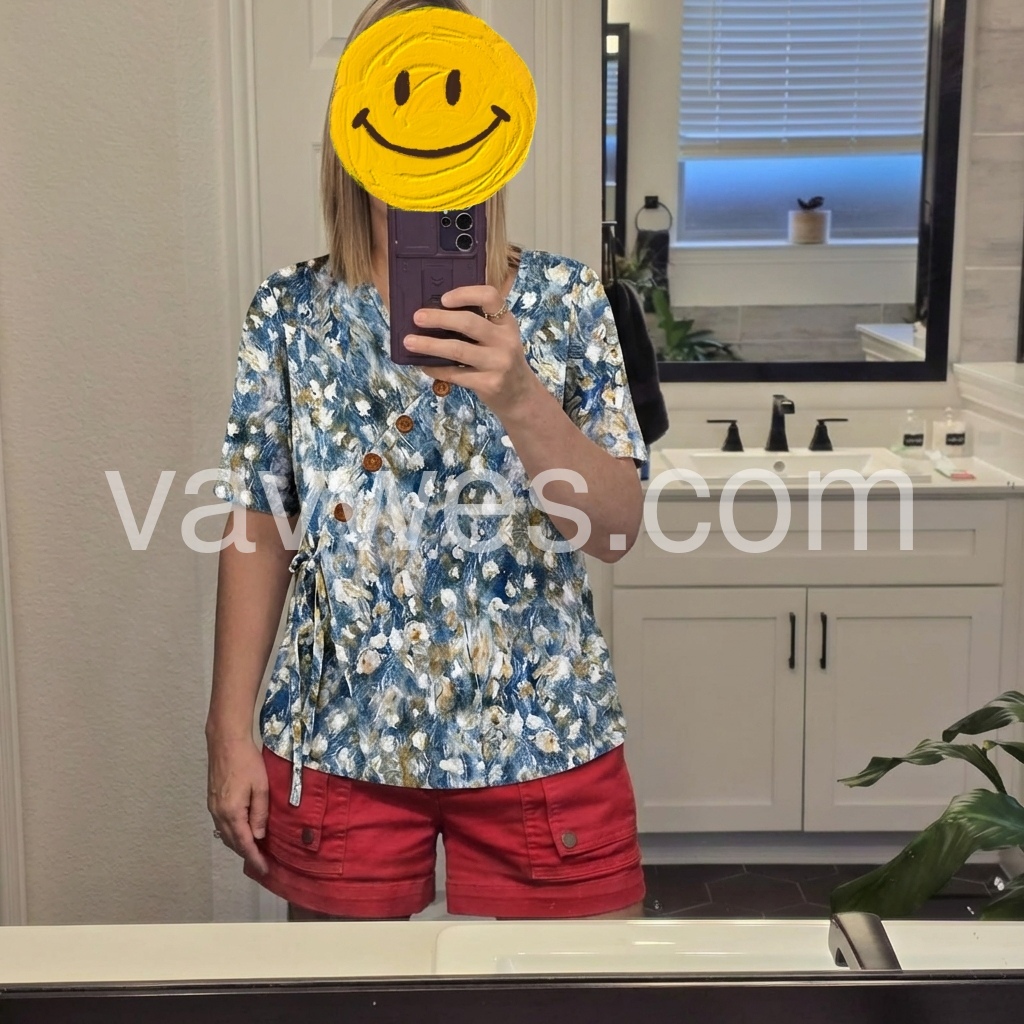 This blouse blends artistic watercolor florals with a flattering wrap silhouette.
