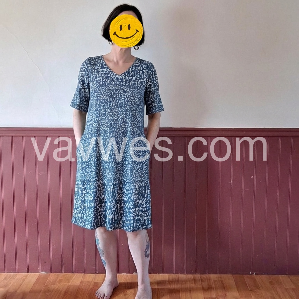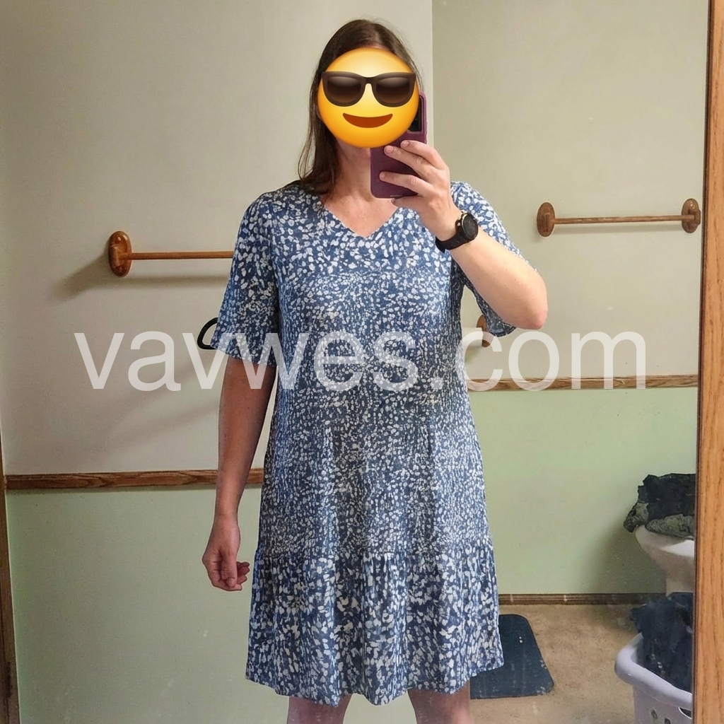 Adorned with a charming blue-and-white floral print, it brings a fresh, vintage vibe to your wardrobe. The subtle tiered hem adds gentle movement.