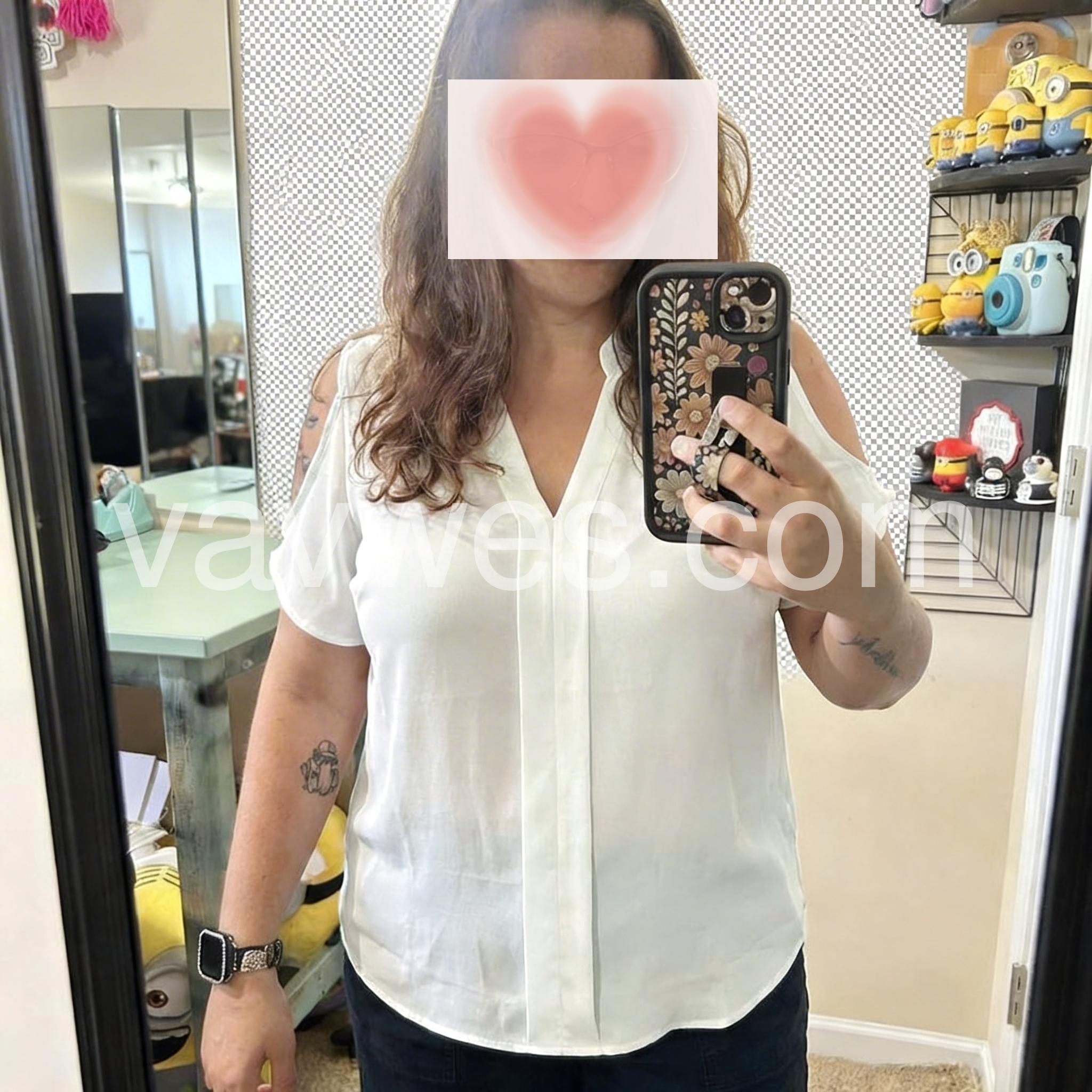 This shirt really flatters my figure. I love loose-fitting shirts, and even though the fabric is a bit thin, it has a great texture. Plus, it always makes me feel like it’s hiding my flaws—really.